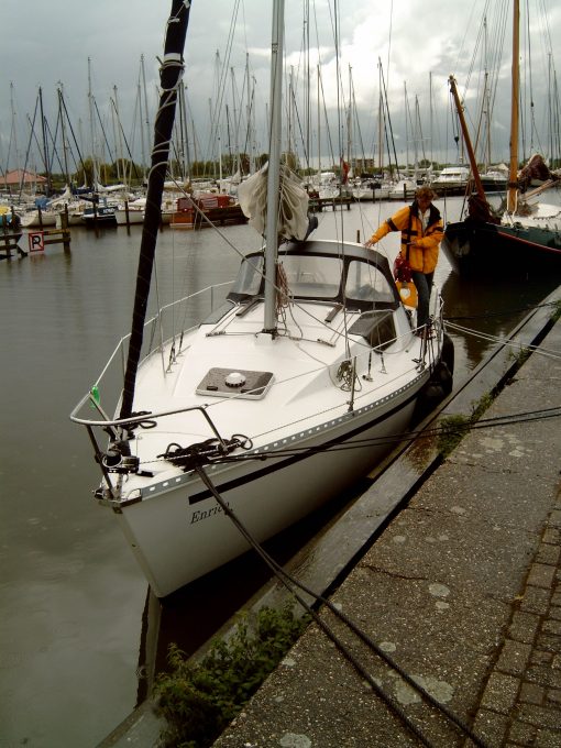 Unser Schiff war eine Gib Sea 76, gechartert bei Yachtcharter Lemmer. Die letzten Wochen vor unserem Urlaub waren heiß, immer über 30°C! Und so kam es wieder einmal, wir haben Urlaub und es regnet und stürmt. Wenigstens hörte der Regen beim Beladen des Schiffes auf. Die Einweisung verlief freundlich und unkompliziert. Alles wurde gecheckt und war in Ordnung. Auf Grund des Wetters blieben wir die erste Nacht am Steg des Vercharters liegen. |