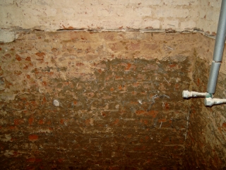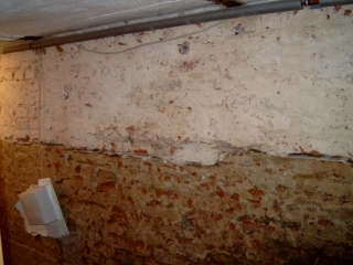 Nach dem der Putz runter war, erkannten wir sehr deutlich, welche Ecken feucht waren. Die alte Horizontalsperre ist noch in Ordnung und grenzt das Mauerwerk deutlich ab. Die Wände haben wir mit einem sehr guten Kalkputz wieder verputzt. Gipskartonplatten sind bei solchen Bedingungen nicht einsetzbar. Das Trocknen des Putzes vor dem ersten Farbanstrich dauerte rund 1 Monat. Dabei hatten wir die Kellerfenster ausgebaut und mit Stahllochplatten versehen. Die Luft konnte dadurch sehr gut zirkulieren und Katzen und Diebe mussten draußen bleiben. |